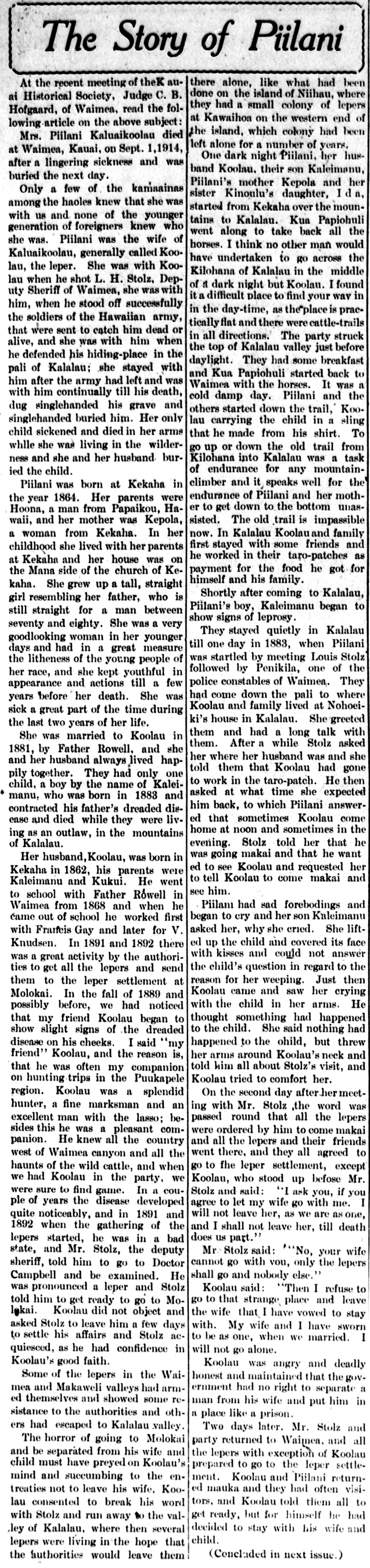 Mrs. Piilani Kaluaikoolau died at Waimea, Kauai, on Sept. 1, 1914, after a lingering sickness and was buried the next day.