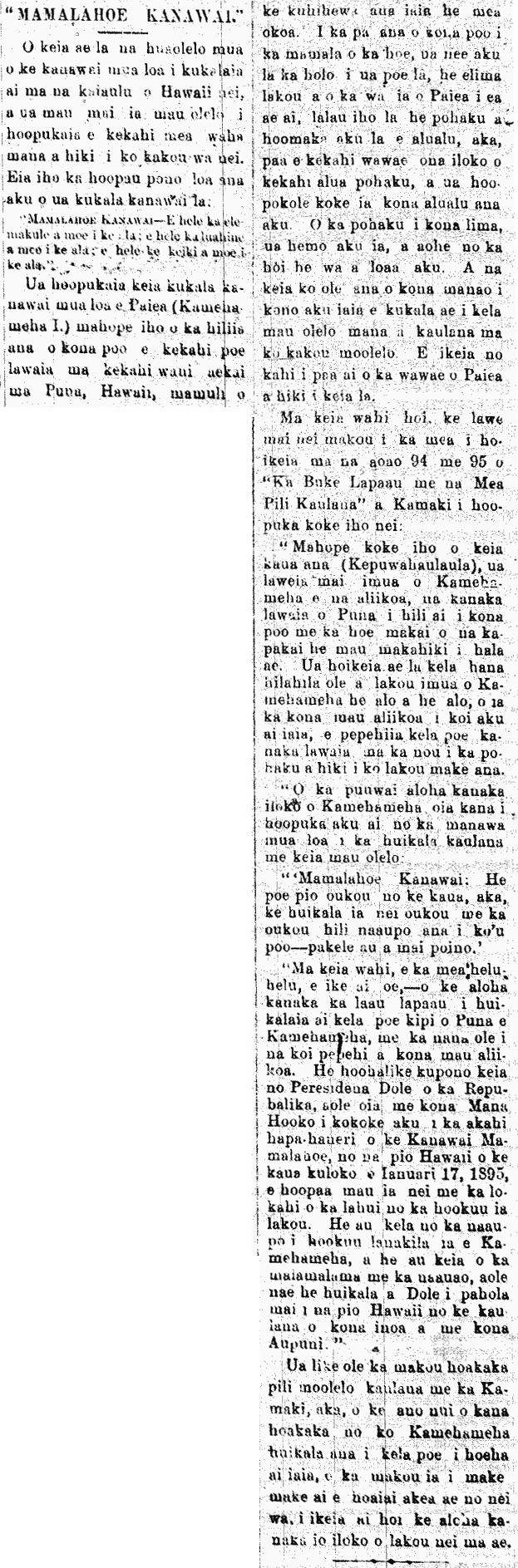 “Here, O Reader, do recognize–love for his fellow man was the cure² for which allowed for the release of these rebels of Puna by Kamehameha, and him not giving regard to the calls by his officers to put them to death. This is a fine comparison to President Dole of the Republic; he with his Executive Powers does not come close to a hundredth of the Kanawai Mamalahoe, in his treatment of the Hawaiian prisoners of the revolution of January 17, 1895 who continue to be imprisoned albeit the lahui are united in wanting them released. That was an uncivilized time when [the men] were triumphantly released by Kamehameha, and this is a knowledge and civilization, and yet Dole has not given clemency to the Hawaiian prisoners for the fame of his name and that of his Nation.”