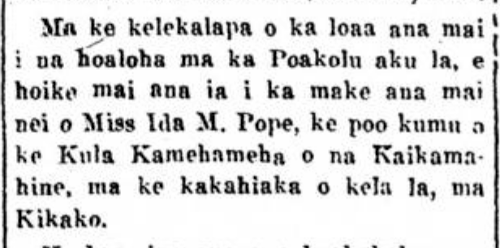 By way of telegraph, the friends on this past Wednesday received news of the death of Miss Ida M. Pope, the principal of the Kamehameha School for Girls, on the morning of that day, at Chicago.