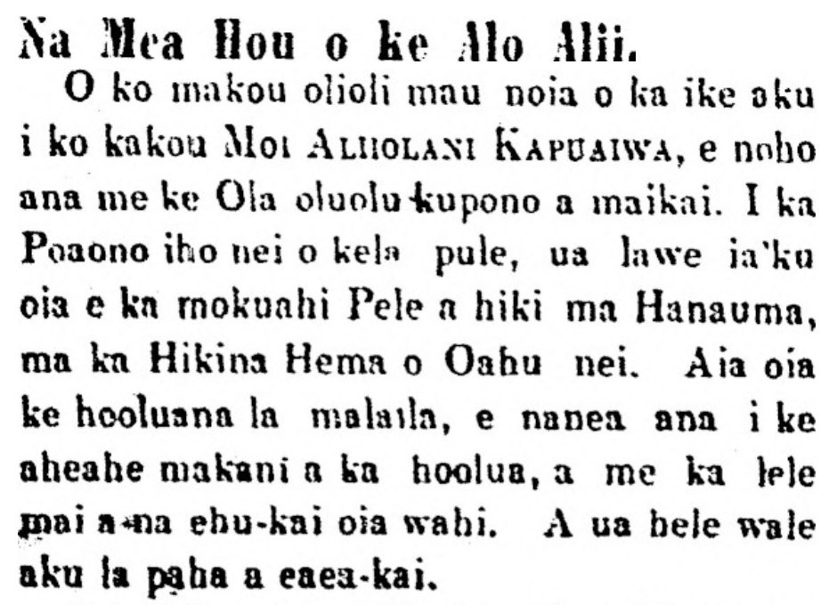 We were happy to see our King Aliiolani Kapuaiwa in good health. Last week Saturday he was taken by the steamship Pele to Hanauma on the south-east of Oahu nei. He is at leisure there, enjoying the softly blowing Hoolua wind, and the flying sea spray. He perhaps has become covered by sea spray.