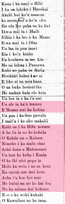 The version of “Kaua i ka Nani o Hilo” most widely known today is probably the one from the Roberts Collection at the Bishop Museum, which is quoted here. The Museum’s Mele Index can be searched online here. But notice that the Punini version has additional verses (highlighted in red).