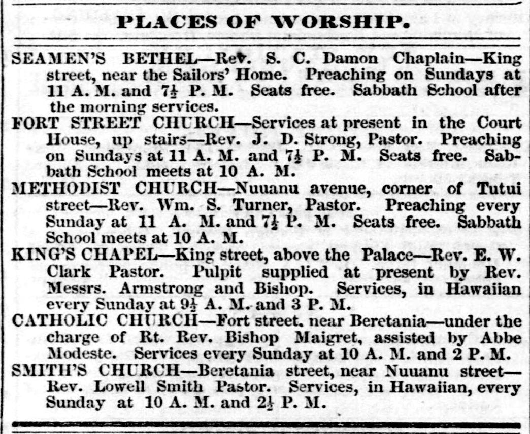 The chancel and pulpit were tastefully decorated with beautiful ferns and palms while above was the Royal Standard of Kalakaua and the Hawaiian flags, both now the property of and loaned by the Kapiolani Estate.