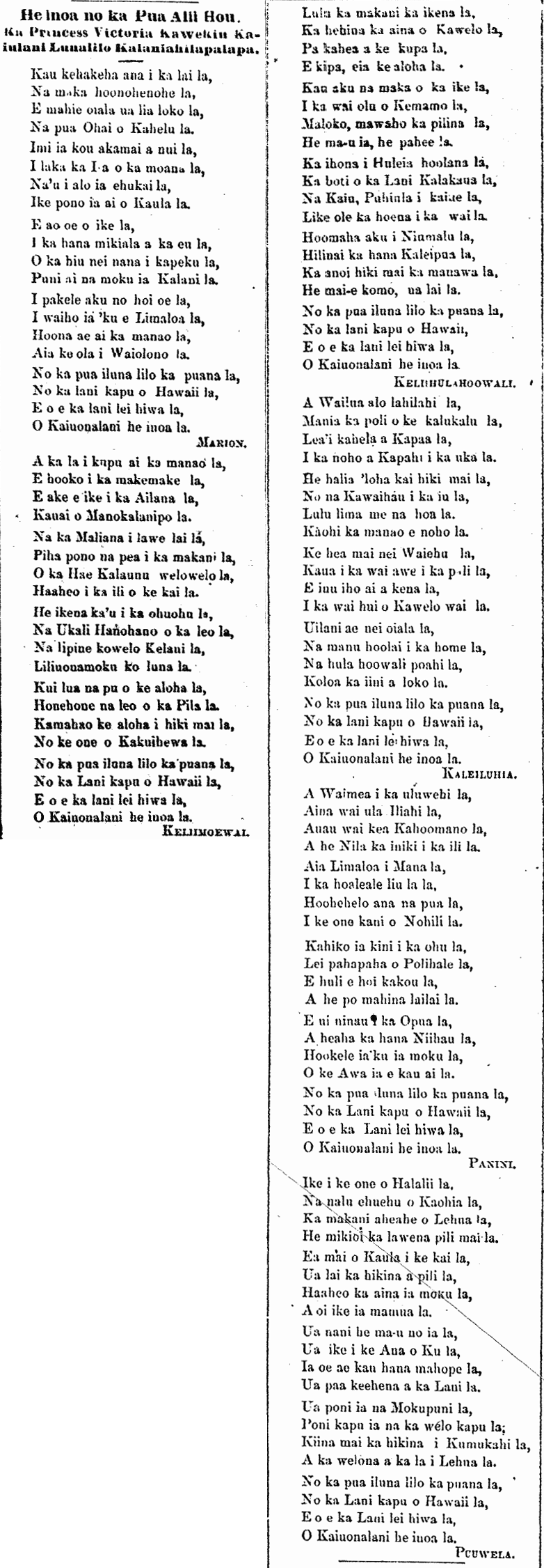 [This mele inoa for Princess Kaiulani is also found under the title “He Inoa no Kaiulani” with the oki by the different composers found scattered in Ed. C. Holstein’s Ka Buke Mele o na Himeni Hawaii. There are variations between the two versions.]