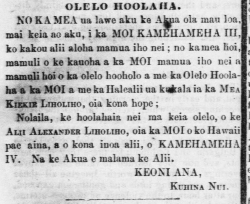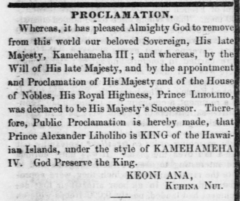 Be it known to all whom it may concern, that We, Kamehameha III, King of the Hawaiian Islands, hereby proclaim our entire Neutrality in the war now impending between the Great Maritime powers of Europe; that Our Neutrality is to be respected by all Belligerents, to the full extent of Our Jurisdiction, which by Our Fundamental laws is to the distance of one of one marine league, surrounding each of our islands of Hawaii, Maui, Kahoolawe, Lanai, Molokai, Oahu, Kauai and Niihau, commencing at low water mark on each of the respective coasts of said Islands, and includes all channels passing between and dividing said islands, from Island to island; that all captures and sizures made within Our said Jurisdiction are unlawful; and that the protection andd hospitality of Our Ports, Harbors and Roads, shall be equally extended to all the belligerents, so long as they respect Our neutrality. Continue reading
