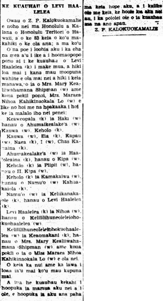 Mrs. Ululani Haalelea was a leader and an adviser of the Beneficent association of this town, from the Beneficent Associations of the haole, to the haole women and to the Hawaiians; she was the vice president of the Ahahui Hoola Lahui of Kalakaua and Kapiolani, she was a distinguished member of the board of trustees of the Maternity Home, and a president of the Choir “Hawaii Noeau.”