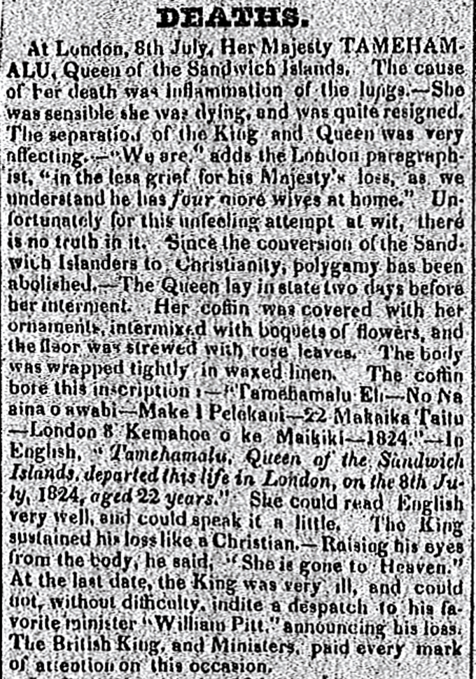 At London, 8th July, Her Majesty TAMEHAMALU, Queen of the Sandwich Islands. The cause of her death was inflammation of the lungs.—She was sensible she was dying, and was quite resigned. The separation of the King and Queen was very affecting.—”We are,” adds the London paragraphist, “in the the less grief for his Majesty’s loss, as we understand he has four more wives at home.” Unfortunately for this unfeeling attempt at wit, there is no truth in it. Since the conversion of the Sandwich Islanders to Christianity, polygamy has been abolished.—The Queen lay in state two days before her interment. Her coffin was covered with her ornaments, intermixed with bouquets of flowers, and the floor was strewed with rose leaves. The body was wrapped tightly in waxed linen. The coffin bore this inscription:—”Tamehamalu Eli—No Na aina o awahi—Make i Pelekani—22 Makaika Taitu—London 8 Kemahoe o ke Maikiki—1824.”—In English, “Tamehamalu, Queen of the Sandwich Islands, departed this life in London, on the 8th July, 1824, aged 22 years.” She could read English very well, and could speak it a little. The King sustained his loss like a Christian.—Raising his eyes from the body, he said, “She is gone to Heaven.” At the last date, the King was very ill, and could not, without difficulty, indite a despatch to his favorite minister “William Pitt,” announcing his loss. The British King, and Ministers, paid every mark of attention on this occasion.