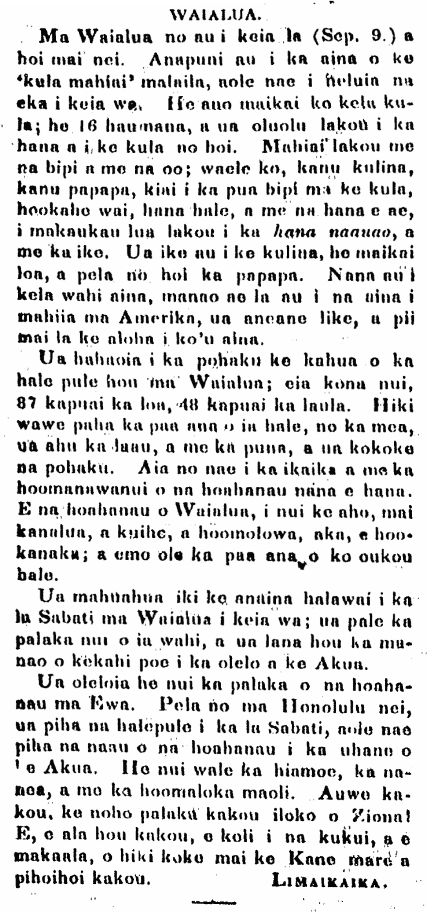 The foundation of the new church in Waialua are filled in with stone; here are its dimensions: 87 feet long and 48 feet wide. The completion of the church will perhaps go quickly, because the lumber and the coral are piled up, and the adobe [pohaku] are soon to come. However, this all depends on the vigor and the patience of the brethren who are working on it. O Brethren of Waialua, be strong, don’t be hesitant and uncertain and lazy, but be courageous and your church will be complete in no time.