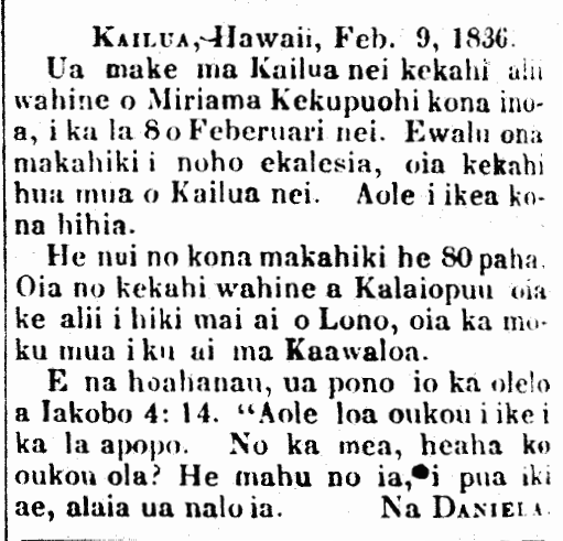 Kalaniopuu saw the many women were at the ocean on the ship to prostitute themselves [hookamakama], so Kalaniopuu forbade women from going down to the ship. And the haole saw that the women were not coming to the ship, so the haole went into the uplands of Napoopoo and at Kahauloa, and on this side of Kaawaloa to solicit prostitution, and the women received a great amount of foreign rubbish [opala]. Continue reading