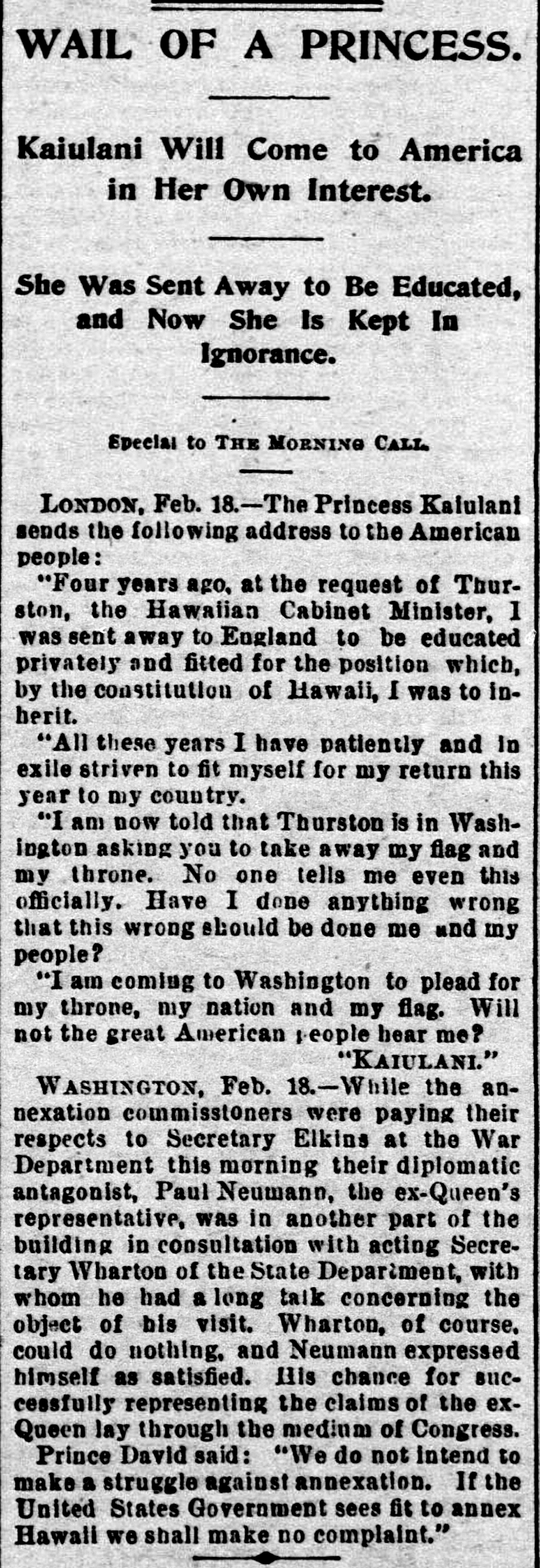 Prince David said: “We do not intend to make a struggle against annexation. If the United States Government sees fit to annex Hawaii we shall make no complaint.”