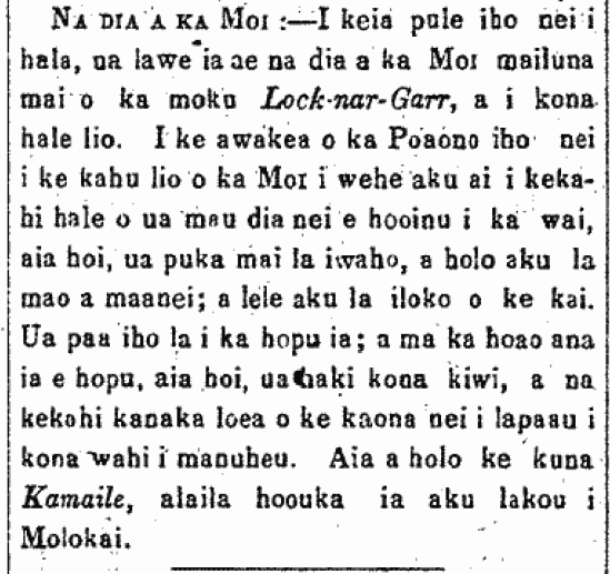 The King’s Deer:—This last week, the King’s deer were taken aboard the ship Lock-nar-Garr [Lochnagar ?] to his stables. At midday on this past Saturday, when the King’s stableman opened a stall where the deer were kept to give them water, come to find out, they got out and ran here and there and jumped into the ocean. They were caught; but while they were being caught, its antler was broken, and someone skilled from town tended to its injury. When the schooner Kamaile sails, they will be taken to Molokai.