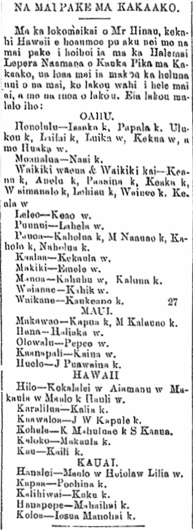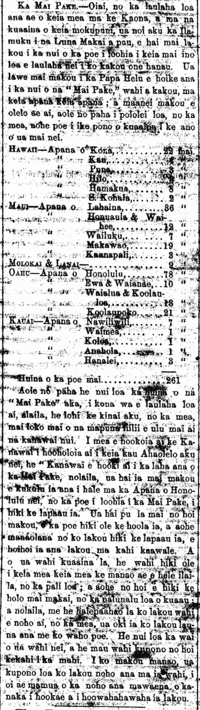 Leprosy [Mai Pake]—As this is greatly spreading about Town and in the country of this island, the Sheriff [Ilamuku ?] has requested that all of the District Sheriffs [Luna Makai ?] to report the number of people inflicted with this horrible sickness that is spreading in our homeland. We have taken the List showing the number of “Chinese Disease,” as we call it, in each district; and we say here that this is probably not accurate, because there is no one in the country who knows for certain what the symptoms are.