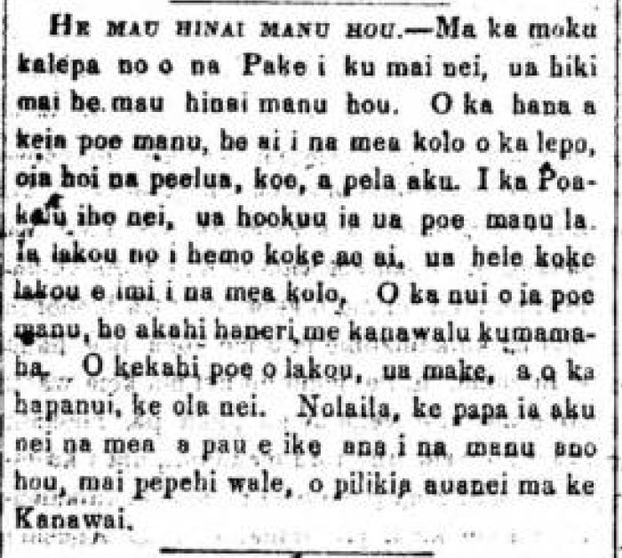 It is right for us to oppose this with what power we have. There are many pests currently brought into Hawaii, and we do not want to bring in others. Before the arrival to Hawaii nei, there were no mosquitoes here, and they could be up at night without their hands tiring out from constantly waving them off. That isn’t all, there is the mongoose that are eating chicks, and eggs, and we hear that a baby left somewhere by its mother while she was washing clothes, died because it was got by a mongoose which sucked all of its blood. There are also mynah birds, fleas, and many, many other pests brought into Hawaii after the arrival of the enlightened races into Hawaii, and here is another thing that is wanted to be open to a person or persons to bring into Hawaii.