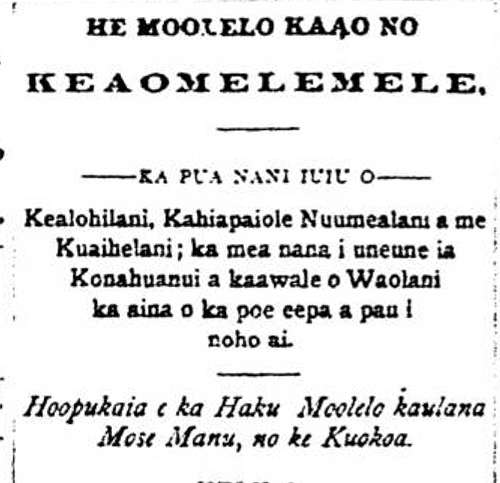 It has been 137 years since the famous Composer of Stories Moses Manu first published the story of Keaomelemele in Ka Nupepa Kuokoa. The story was translated by Mary Kawena Pukui many years ago and was first published in Hawaiian and English in 2002. It has been out of print for years.