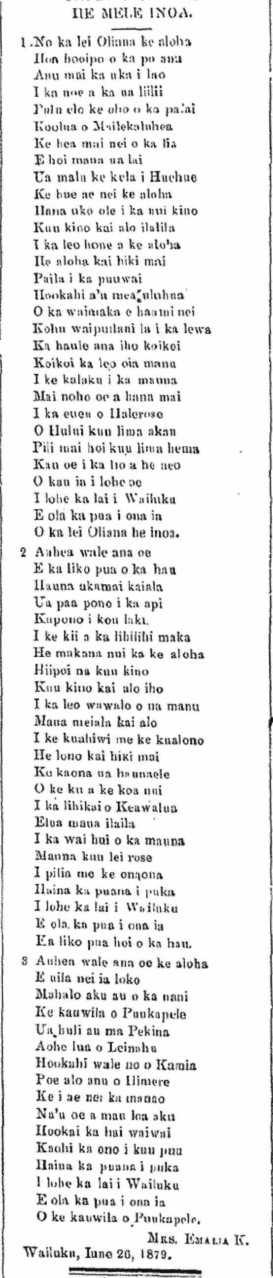 [There is one oki of this mele found in the 5/28/1868 issue of Au Okoa by Kekuanaoa, one in the 6/18/1868 issue without an attribution, one in the 7/23/1868 issue by Kamehameha III; three in the 7/30/1868 issue, one by Kalama, one by Kaomi, and the other by Liliha. There are also many issues that are missing for this newspaper, and who knows what treasures might be found once copies of those issues are found!]
