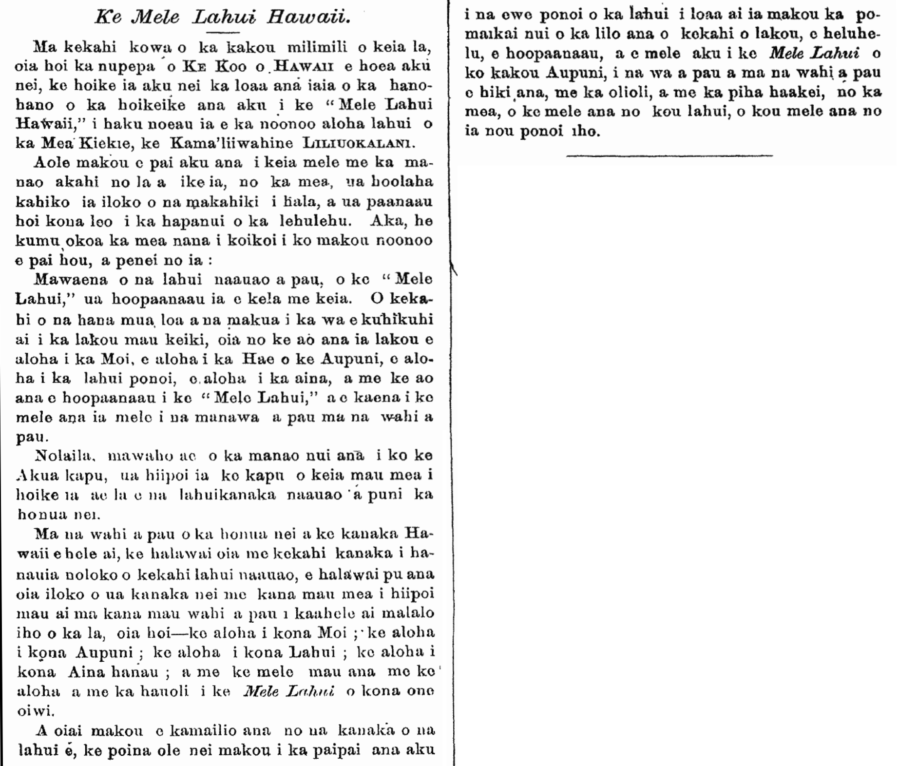 In an open space in our beloved one of this day, that being the newspaper “Ke Koo o Hawaii,” that is coming to you, it is being shown that we have the honor of putting before you the Hawaiian National Anthem [“Mele Lahui Hawaii”] which was skillfully composed with feelings of aloha for her people by Her Highness, Princess Liliuokalani.