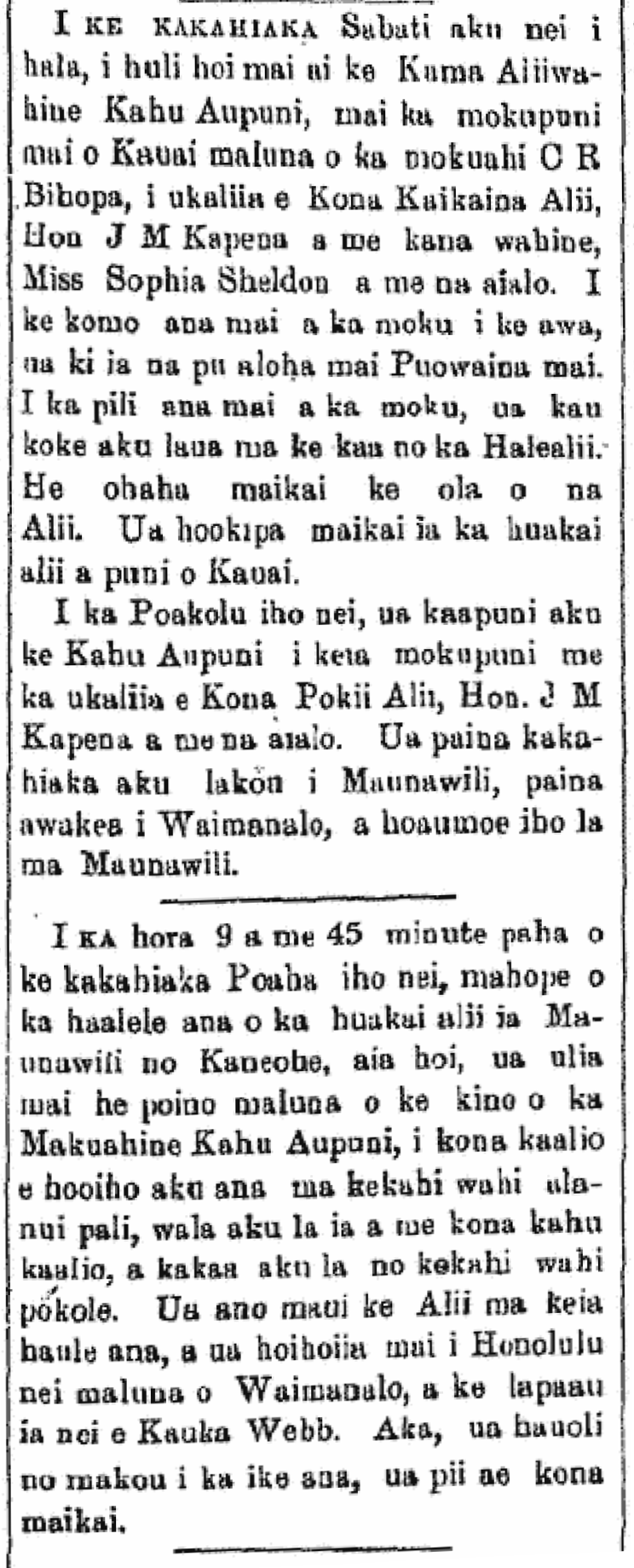 “To His Majesty Kalakaua, Sire: Permit us in the name of the people of Lahaina to present our sincere congratulations on the birth of a new Princess. The birth of a new scion of the ancient family of Chiefs of which Your Majesty is the head, affords new cause for rejoicing among Your people. Our prayer is that Heaven may shower its choicest blessings on the infant Princess, that she may be granted a long liife, and become an honor and a blessing to the Royal Family of Hawaii nei.”