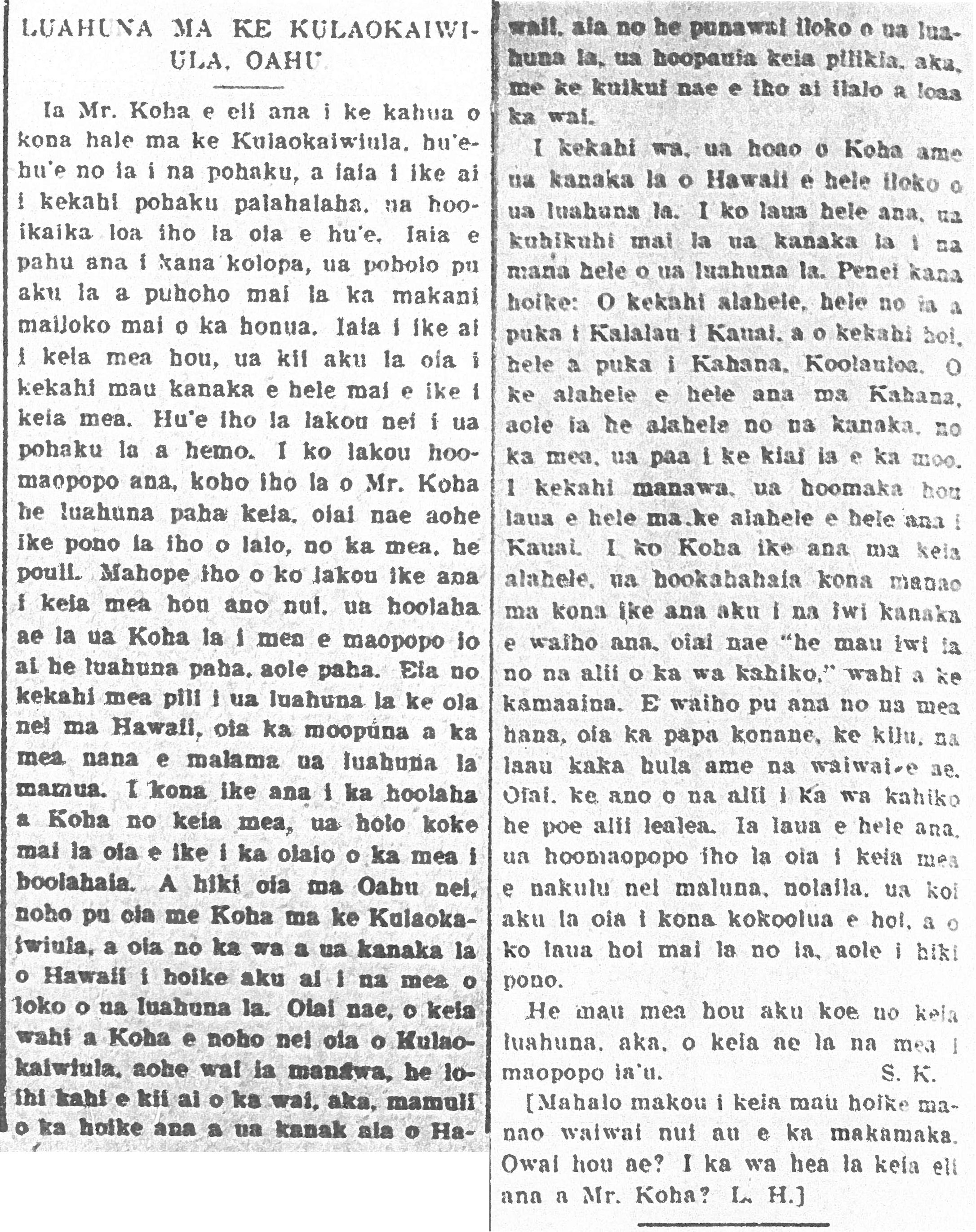 While Mr. Koha was digging the foundation of his house at Kulaokaiwiula [Kekulaokaiwiula], he excavated some rocks, and as he noticed a flat rock he put exerted himself in pulling it up; as he shoved down his crowbar, it slipped in and wind came blowing up from the earth. Discovering this new thing, he fetched some people to come and see it. They pried up the rock. After they saw this, Mr. Koha supposed that it possibly was a hidden cave [luahuna], although the bottom couldn’t be clearly seen because it was dark. After this great discovery, Mr. Koha put out an announcement, so that it would be clear whether it was a hidden cave or not. There was someone who was associated with this hidden cave on Hawaii, the grandchild of the caretaker of the luahuna previously. When he saw Koha’s ad about this thing, he came at once to check if what was advertised was true.  He arrived on Oahu and stayed with Koha at Kulaokaiwiula, and that was when that man from Hawaii told him about what was in that cave. Being that there was no water at this place, Kulaokaiwiula, when Koha was living there, you had to go far to fetch water; however, according to what the man from Hawaii said, there was a spring in the cave, and so that problem was solved, although you had to go down with a light [kuikui] to get the water.