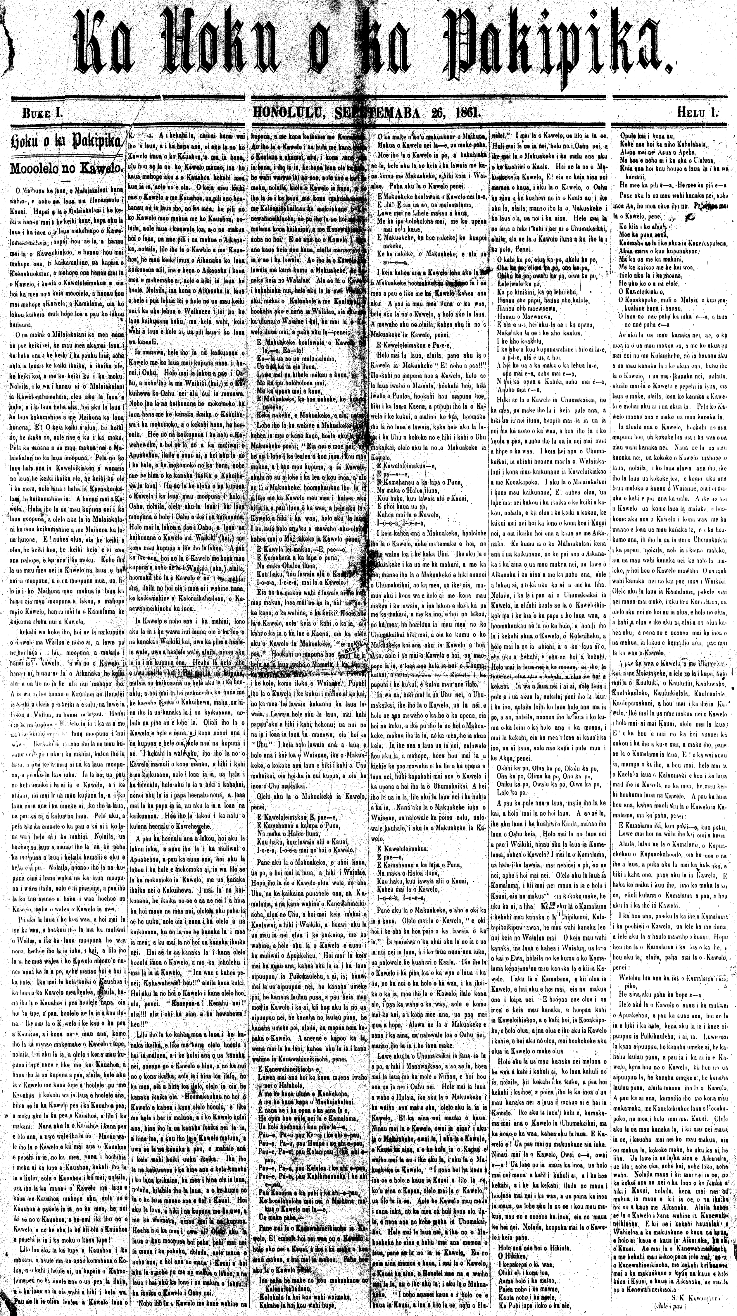 Before you, all those who want to write and publish stories (mooolelo and kaao) in the Hoku o ka Pakipika: you must all write the whole story from the beginning all the way until the end. Because it will be a waste of time to start printing before it is completed, as Kawelo by the person who submitted it, was printed in the Hoku o ka Pakipika [“Mooolelo no Kawelo” by S. K. Kawailiula from 9/26/1861 to 12/5/1861—5 helu total].