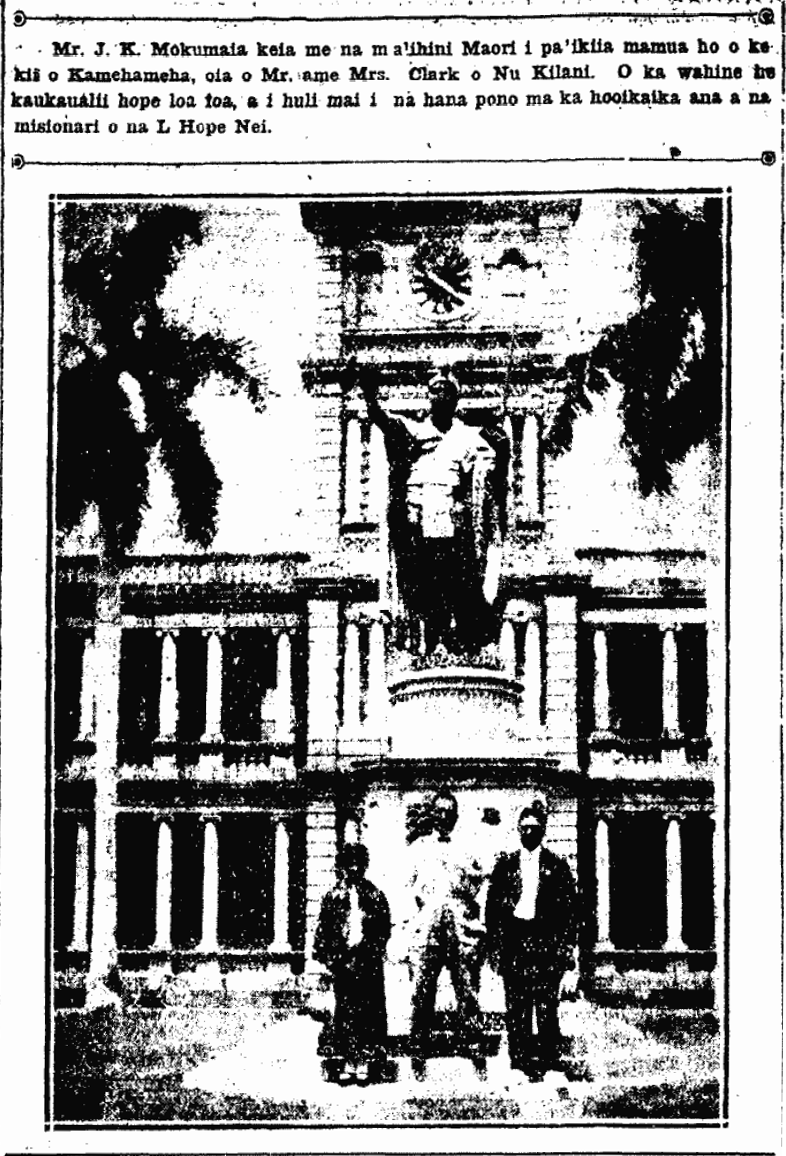 This is Mr. J. K. Mokumaia with the Maori malihini, photographed before the statue of Kamehameha; they are Mr. and Mrs. Clark of New Zealand. The woman is the last kaukau alii [kaukaualii hope loa ??], and they came to do good works by strengthening the missionaries of the Latter Day.
