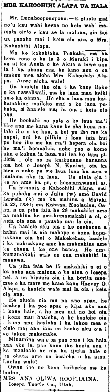 Also, there is Naihe, a child of D. B. Mahoe of Hana; he is family there; he has eight children living. George Hubbel formerly of Honolulu, his wife, and their children, and so many more other Hawaiians gave their aloha to their family here in the land of their birth. According to some of them, it is their homeland, the treatment of the church elders is good, and the thought to return to the land of their birth is very far away, except for the fact that their aloha for Hawaii is not gone, as for their kin at home with their never-ending thoughts of them.