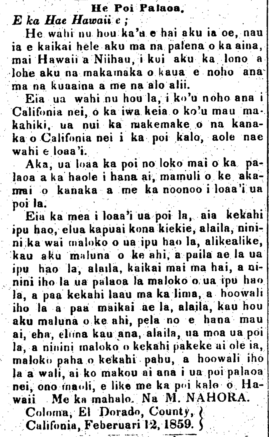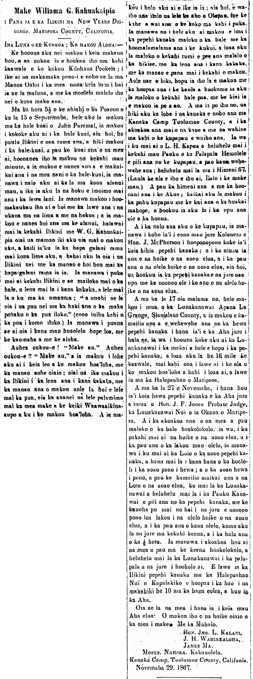 O You guys! I am dead. Hey you guys!! and when we heard this call by our friend, we didn’t believe it was true, for when we saw the Indian pull back his bow, we thought that he wouldn’t let the arrow fly, but no, the weapon of the Ignorant [Waawaaikinaaupo] youth flew swiftly and struck our friend. And when we approached to see him, he already lay there, his last breath gone with blood flowing profusely from the wound. Right then we went to look for the murderer in the store aided by the light of a lamp and we found him in a room hiding under a couch; he was pulling back his bow, thinking to shoot one of us. But he was not able to because he was grabbed by us and tied up with rope and thrown into a secured building which we guarded all night until day. And on the next night, the news reached those living at Kanaka Camp, Tuolumne County, and when the men and women had gathered by where the body lay, then L. H. Kapua stood and read some passages from the Holy Book about the dead one, and after his talk, he read Hymn 67 (Wide is the path to go down, Down to eternal death). And after the hymn was over and the glorification of God, we carried the coffin with the procession following behind, and let it down into the depths of the bowels of the earth.