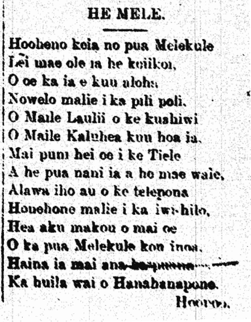 This mele is also printed in the very next issue of Ko Hawaii Pae Aina, 10/12/1878, p. 4, with some variation.]