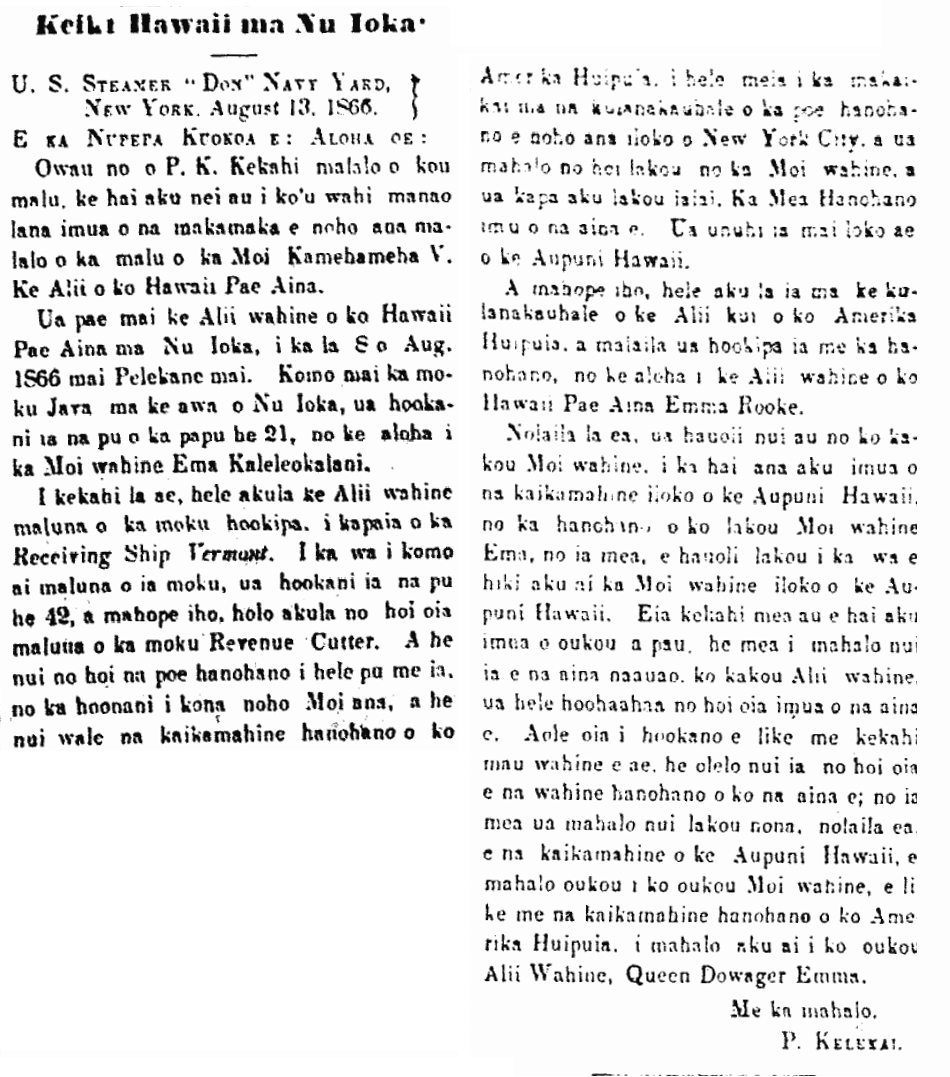 I don’t know when I was born, but I was born before the arrival of the missionaries. I was very small at that time, and maybe I was this tall. One day, we boarded a canoe, her Uncle and five others; they wanted to visit Molokai. They were caught up in a storm in the middle of the ocean, and blown outward; they did not eat for ten days and nights. Because I was so young, I cried a lot. I wanted to eat, and I was thirsty. We had nothing to eat, and had no water left. Water came in the waa, and some of us drank the bilge water. We were near crazy with hunger and thirst. We lost hope that we would live. One day we spotted a ship. We tried to get noticed. We were fetched and taken aboard the ship. My duty aboard the ship was to care for the children. The captain and his wife were kind. We landed at Lardone [??]. Five of them got off with the intent of living there. We heard that they were eaten after that by the people this place. My uncle and I went all the way to China. I cared for the baby some missionaries, Mr. and Mrs. Brown. Thereafter, my uncle died and I was left alone with those haole. I was the caretaker of the baby. I lived for perhaps six whole years in China. I travelled around many places. Later, Mrs. Brown died. I lived with Mr. and Mrs. Bates. After that he wanted to go to California to prospect for gold. We accompanied him on a boat, and saw Cape Horn [Kepahoni], that place famous for rough seas. I saw many lands. I lived for three months in the gold fields. I wanted very much to return to Hawaii. Afterwards, these haole agreed and we all left for Hawaii nei. When we arrived, I immediately wrote to my parents and younger siblings. They came to Honolulu at once. They believed that I had died earlier. My father died without me knowing him.
