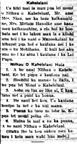 [Abbie P. Palea had a regular column in Hoku o Hawaii, writing about various happenings on Kauai. She often wrote in with poetic compositions by her own hand. Here is just one of them. Although you will find credit given to Joseph Kelly (Keʻale), at the Bishop Museum’s Niihau Shell Lei Exhibit going on now (see it while you can!), i would suggest that because there seems to be no counter claims in later newspapers to Palea’s statement, that “Niihau o Kahelelani Hula” was indeed written by her.