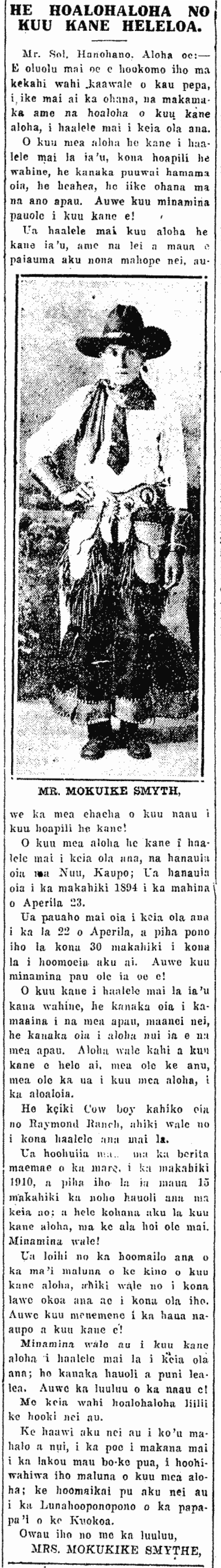 I give my deep appreciation to those who offered their bouquets of flowers which adorned my beloved; I also give thanks to the Editor of the press of the Kuokoa.