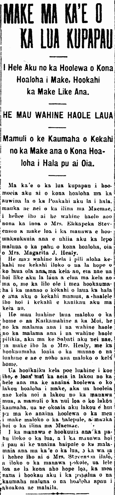 [Memorial Day (Decoration Day), which was held on the 30th of May and is now held on the last Monday of May, can be found in the Hawaiian-Language Newspapers as La Kaupua (“day to place flowers”) or La Lupua (“day to strew flowers”).]