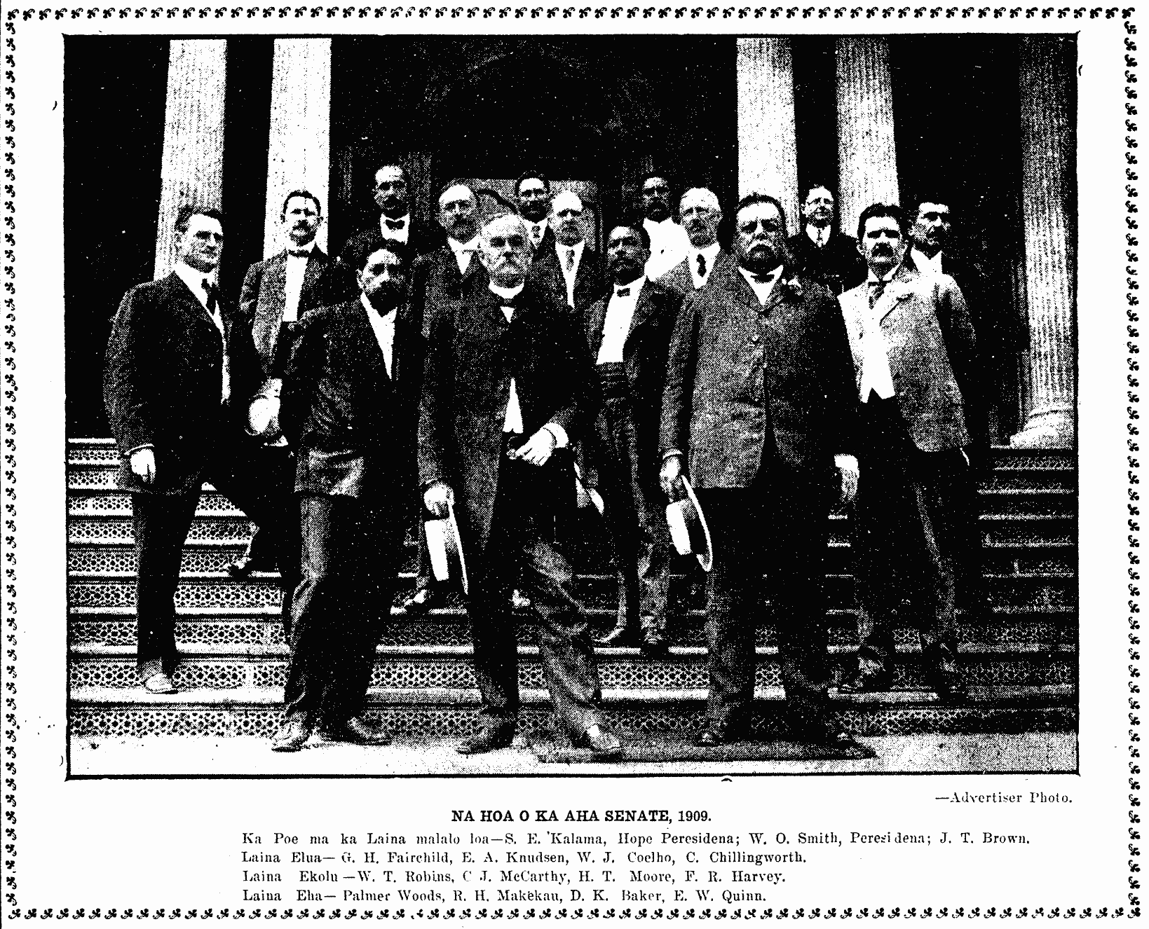 Being that, (1.) On that Great Seal, is the foundation of the first Seal of the Monarchy of Hawaii nei. (2.) There is the stripes of the Hawaiian Flag of the Monarchy. (3.) There stand puloulou, a symbol of the Hawaiian Monarchy of old. (4.) There is an image of Kamehameha I., the King who unified the Hawaiian Archipelago into one Nation. (5.) There are the words—”Ua Mau ke Ea o ka Aina i ka Pono” affixed onto this new Seal, the words given by King Kamehameha III after the restoration of the Independence of Hawaii nei by Great Britain.