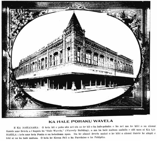 O FRIENDS: This picture that is being printed is an image of the stone building standing at the corner of Hotel [Hotele] and Bethel [Betela] Streets, called the Waverly Building [Hale Wavela], and on the second story is where the LANAKILA appears every Thursday of every week. It is on Bethel Street, makai of the Hotel Street corner where the stairs are to get to the second story. This is the Printing Office of the Paradise of the Pacific [Paredaiso o ka Pakipika].