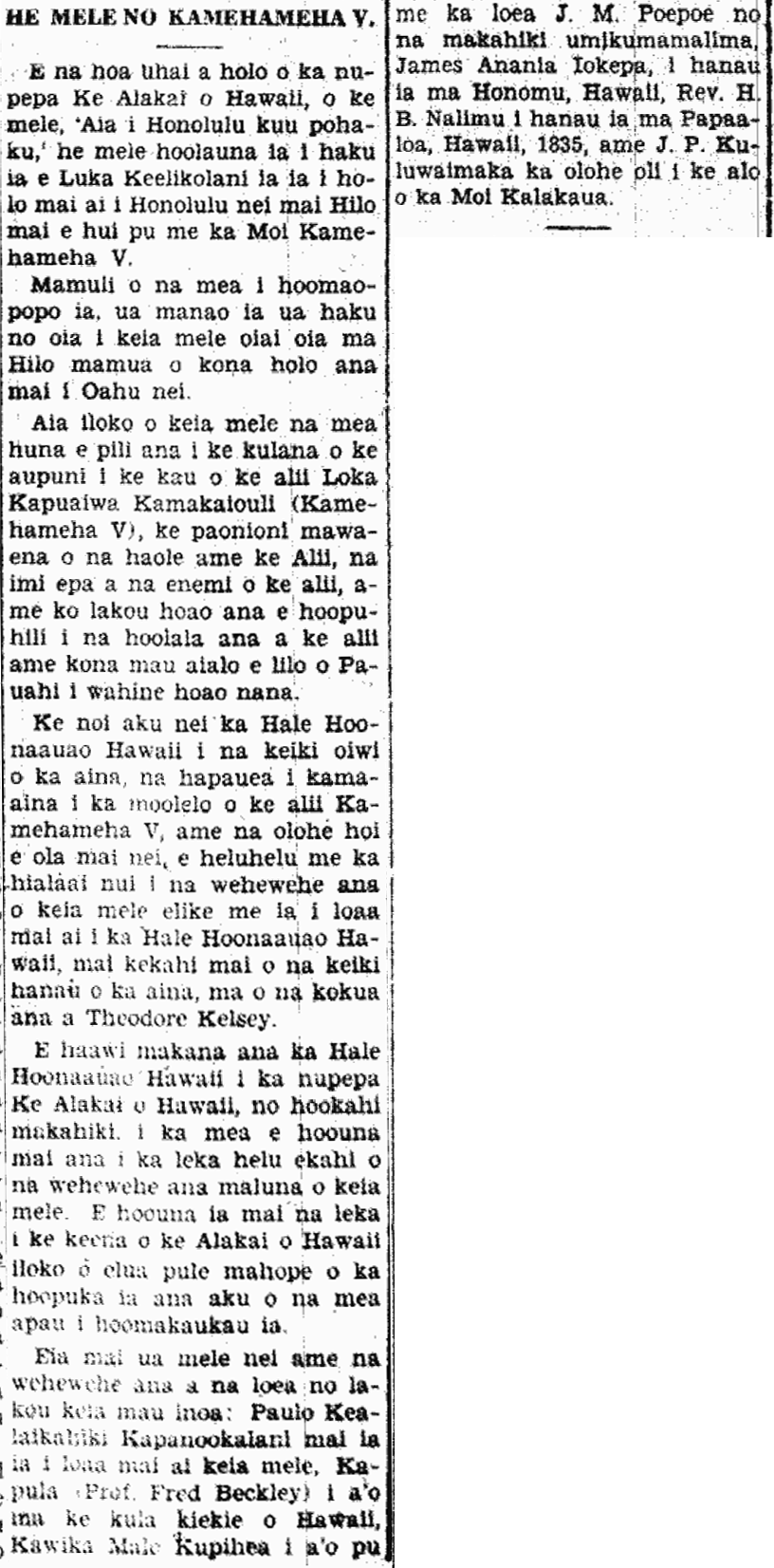 After stomachs [ka lua o ka inaina] were filled, everyone enjoyed some songs from the boys of Kamehameha, and also from the girls, and the Honolulu band, then the speeches of the night were heard.