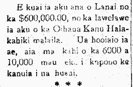 Last Tuesday the deal went through for Hawaiian Pineapple Company to purchase the land, the animals, and all equipment of Frank F. Baldwin and Harry A. Baldwin upon the Island of Lanai.