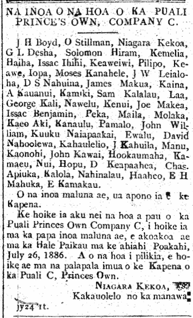 The Prince’s Own Company of volunteers presented Her Royal Highness with a silver ice cream service, accompanied with a plush silk tablet and the following inscription: “Liliuokalani, from the Prince’s Own Corps, Sept. 2, 1886.” Captain James Boyd, in making the presentation, said: