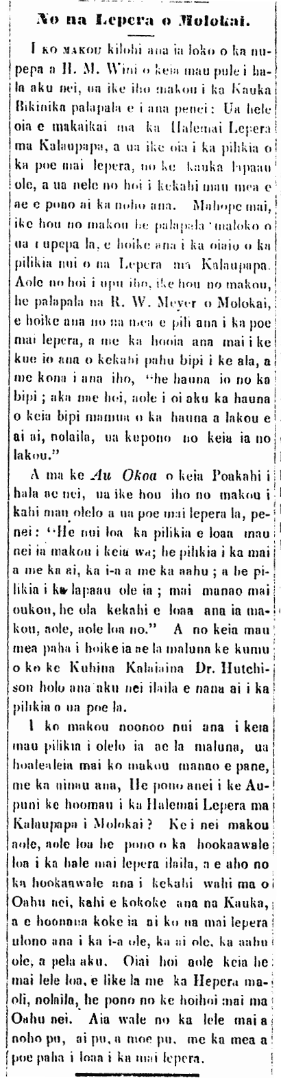 I spoke of the coconut grove of Kamehameha V in Kalamaula. It is said that it was Kamehameha V who planted that coconut grove in 1864. The truth is that it was Meyer senior [Maea makua]—during the time of the King, Kamehameha IV who planted it. That was when Meyer married the mother of the Meyer family. When they were wed, they went upland of Kalae, and built a little house. It was a grass hut. Meyer began to work hard and peddled butter. After, Meyer was granted the care over the lands of Kamehameha IV, he planted coconuts by the beach, as a place to go for his lord the alii. It was Meyer who planted them, and not anyone else. Meyer himself told an important man of Honolulu, and it was from him I got this information.]