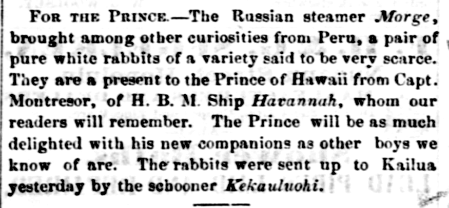 For the Prince—The Russian steamer Morge, brought among other curiosities from Peru, a pair of pure white rabbits of a variety said to be very scarce. They are a present to the Prince of Hawaii from Capt. Montresor, of H. B. M. Ship Havannah, whom our readers will remember. The Prince will be as much delighted with his new companions as other boys we know of are. The rabbits were sent up to Kailua yesterday by the schooner Kekauluohi.