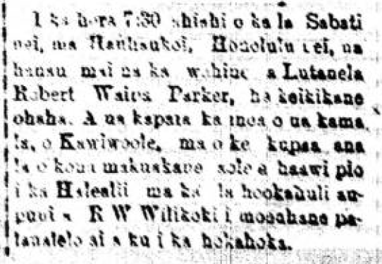 At 7:30 in the evening of this Sabbath at Hauhaukoi, Honolulu nei, born to the wife of Lieutenant Robert Waipa Parker, was a plump boy. The child was named Kawiwoole, because of the steadfastness of his father not to surrender the Palace on the day of the overthrow of the government [hookahuli aupuni] which R. W. Wilcox lazily dreamt up and was thwarted.