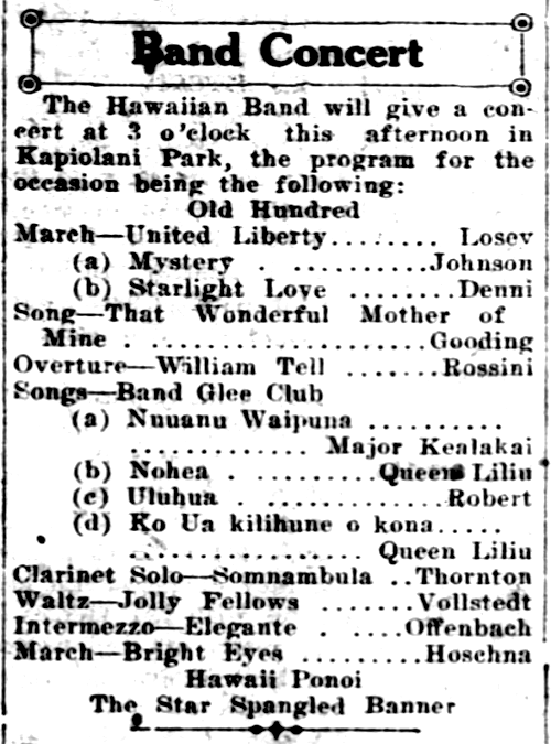 Here we are speeding about here and there. There is much praise for the band and the Hawaiian singing and the hula; Professor Solomon Hiram’s deft playing of the banjo strings is superb, making the American women move indeed. Continue reading