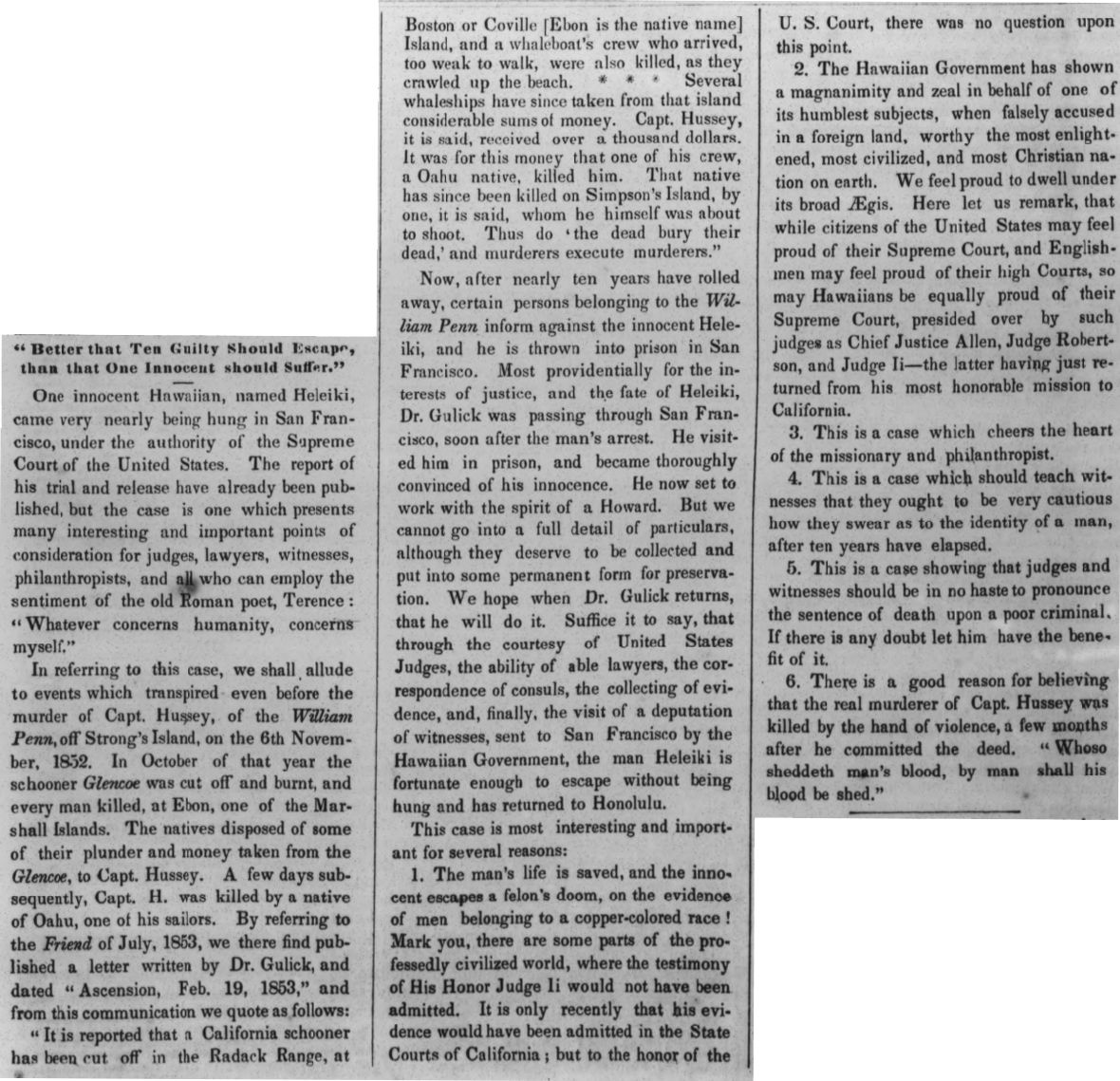 Now, after nearly ten years have rolled away, certain persons belonging to the William Penn inform against the innocent Heleiki, and he is thrown into prison in San Francisco. Most providentially for the interests of justice, and the fate of Heleiki, Dr. Gulick was passing through San Francisco, soon after the man’s arrest. He visited him in prison, and became throughly convinced of his innocence. He now set to work with the spirit of a Howard. But we cannot go into a full detail of particulars, although they deserve to be collected and put into some permanent form for preservation. We hope when Dr. Gulick returns, that he will do it. Suffice it to say, that through the courtesy of United States Judges, the ability of able lawyers, the correspondence of consuls, the collecting of evidence, and, finally, the visit of a deputation of witnesses, sent to San Francisco by the Hawaiian Government, the man Heleiki is fortunate enough to escape without being hung and has returned to Honolulu.