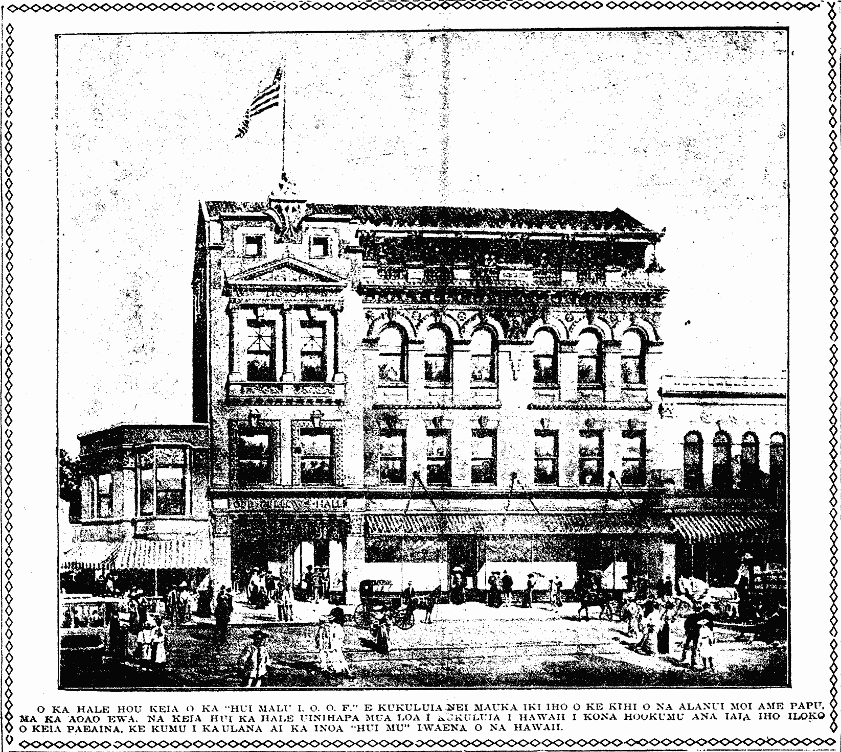THIS IS THE NEW BUILDING OF THE “SECRET SOCIETY I. O. O. F.” [“HUI MALU I. O. O. F.”] BEING BUILT A LITTLE MAUKA OF THE CORNER OF KING AND FORT STREETS, ON THE EWA SIDE. IT WAS THIS ORGANIZATION THAT HAD THE FIRST BRICK BUILDING BUILT IN HAWAII AT ITS ESTABLISHMENT IN THIS ARCHIPELAGO, THE REASON WHY THE NAME “SECRET SOCIETY” [“HUI MU”] BECAME FAMOUS AMONGST THE HAWAIIANS.