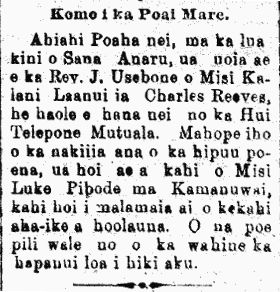 In the evening of this past Thursday, at Saint Andrews Church [luakini o Sana Anaru], joined by the Rev. J. Usebone was Miss Kalani Laanui and Charles Reeves, who is a haole that works at the Mutual Telephone Company [Hui Telepone Mutuala]. After the bond was tied, they went to place of Miss Luke Peabody [Lucy Pibode] at Kamanuwai, where a reception was held. A great majority of the people who came were those who know the bride.