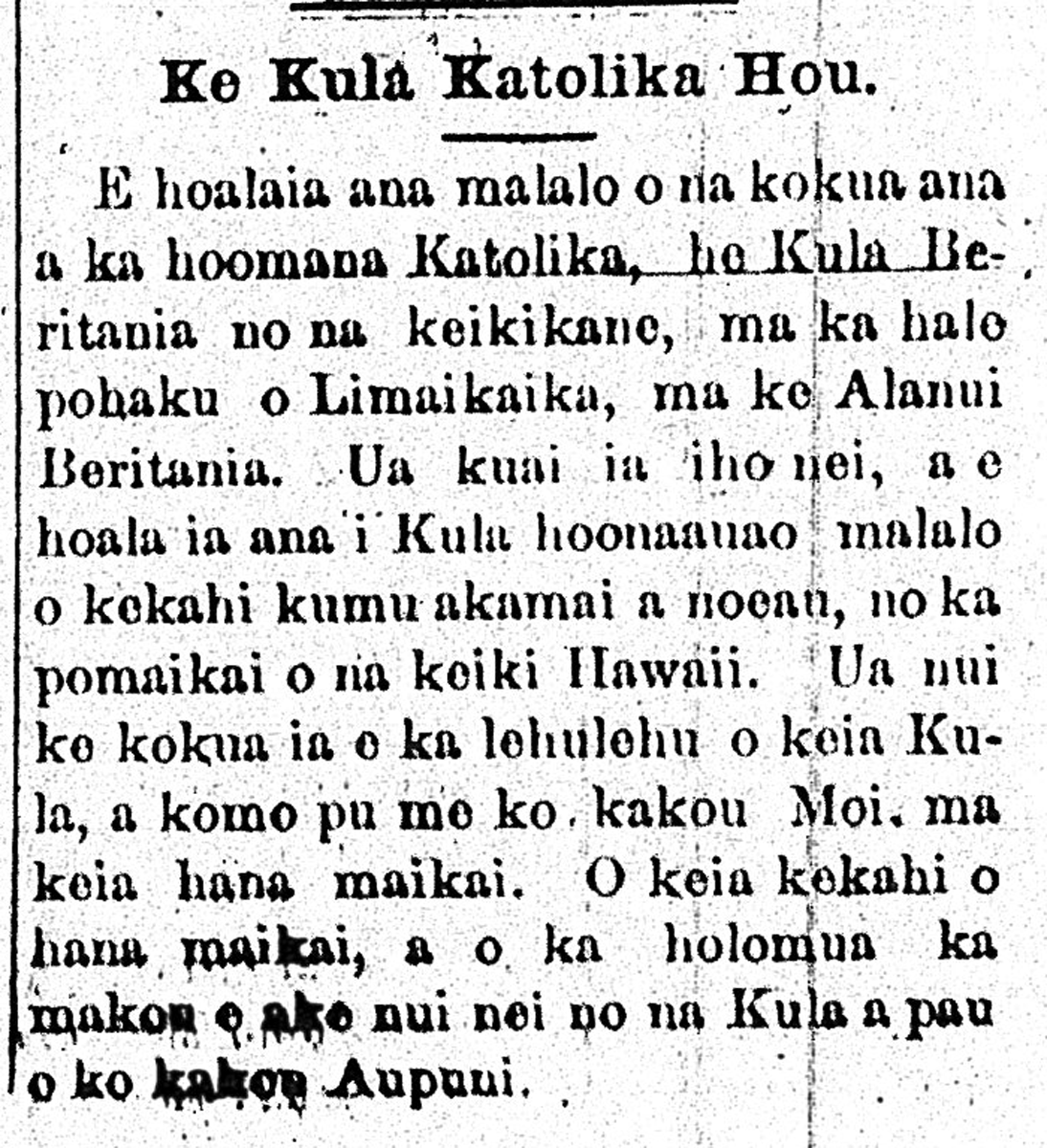 There will be established under the Catholic Faith, an English school for boys, at the stone building of Armstrong [Limaikaika], on Beritania Street. It was recently purchased, and a school of learning will be set up for the benefit of Hawaiian boys. This school is greatly supported by the public, along with our King, at this fine endeavor. This is one of the fine works, and is progress that we greatly desire for all of the Schools of our Nation.