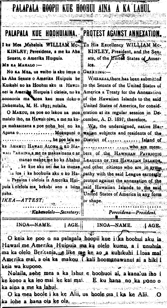 We, the undersigned, native Hawaiian subjects and residents of the District of …………………… Island of ……………………., who are members of the Hawaiian Patriotic Leagues of the Hawaiian Islands, and other citizens who are in sympathy with the said League earnestly protest against the annexation of the said Hawaiian Islands to the said United States of America in any form or shape.