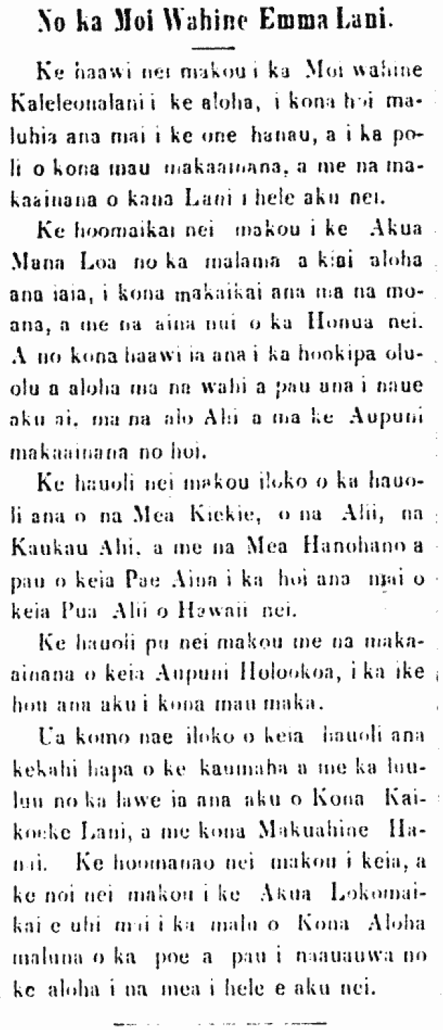We extend aloha to Queen Kaleleonalani with her safe return to her birth sands, and to the bosoms of her makaainana and the makaainana of her Chief one who has departed.