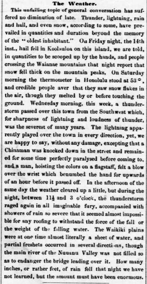This unfailing topic of general conversation has suffered no diminution of late. Thunder, lighting, rain and hail, and even snow, according to some, have prevailed in quantities and duration beyond the memory of the “oldest inhabitant.” On Friday night, the 14th inst., hail fell in Koolauloa on this island, and we are told, in quantities to be scooped up by the hands, and people crossing the Waianae mountains that night report that snow fell thick on the mountain peaks. On Saturday morning the thermometer in Honolulu stood at 53°, and credible people aver that the saw snow flakes in the air, though they melted by or before touching the ground. Wednesday morning, this week, a thunderstorm passed over this town from the Southwest which, for sharpness of lightning and loudness of thunder, was the severest of many years. The lightning apparently played over the town in every direction, yet, we are happy to say, without any damage, excepting that a Chinaman was knocked down in the street and remained for some time perfectly paralysed before coming to, and a man, hoisting the colors on a flagstaff, felt a blow over the wrist which benumbed the hand for upwards of an hour before it passed off. In the afternoon of the same day the weather cleared up a little, but during the night, between 11½ and 3 o’clock, the thunderstorm raged again in all imaginable fury, accompanied with showers of rain so severe that it seemed almost impossible for any roofing to withstand the force of the fall or the weight of the falling water. The Waikiki plains were at one time almost literally a sheet of water, and partial freshets occurred in several directions, though the main river of the Nuuanu Valley was not filled so as to endanger the bridge leading over it. How many inches, or rather feet, of rain fell that night we have not learned, but the amount must have been enormous.