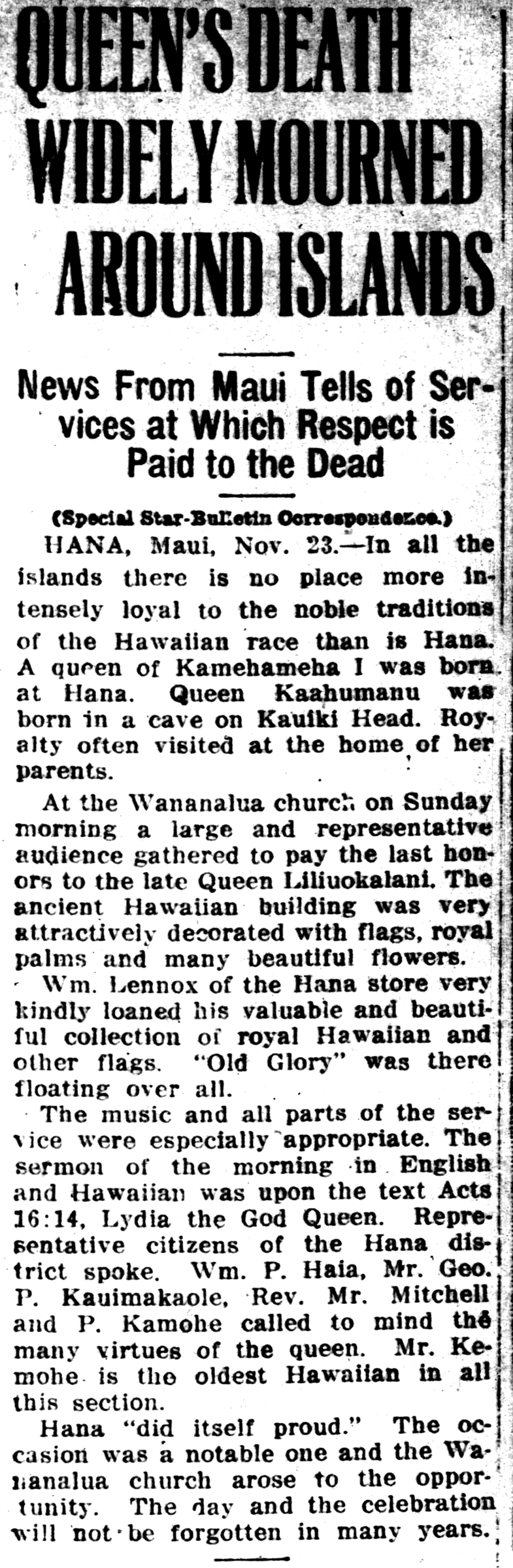 The music and all parts of the service were especially appropriate. The sermon of the morning in English and Hawaiian was upon the text Acts 16:14, Lydia the God Queen. Representative citizens of the Hana district spoke. William P. Haia, Mr. George P. Kauimakaole, Rev. Mr. Mitchell and P. Kamohe called to mind the many virtues of the queen. Mr. Kemohe is the oldest Hawaiian in all this section.