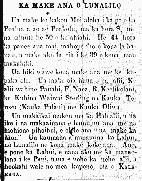 We visited the Palace and saw the makaainana murmuring about with worried faces, saying, “The King is dead.” The Lahui are sad and grieve over the quick passing of Lunalilo. The Lahui must at once look with hope to his Replacement, the one who will occupy the throne, and there is but one who is fitting, that is Kalakaua.
