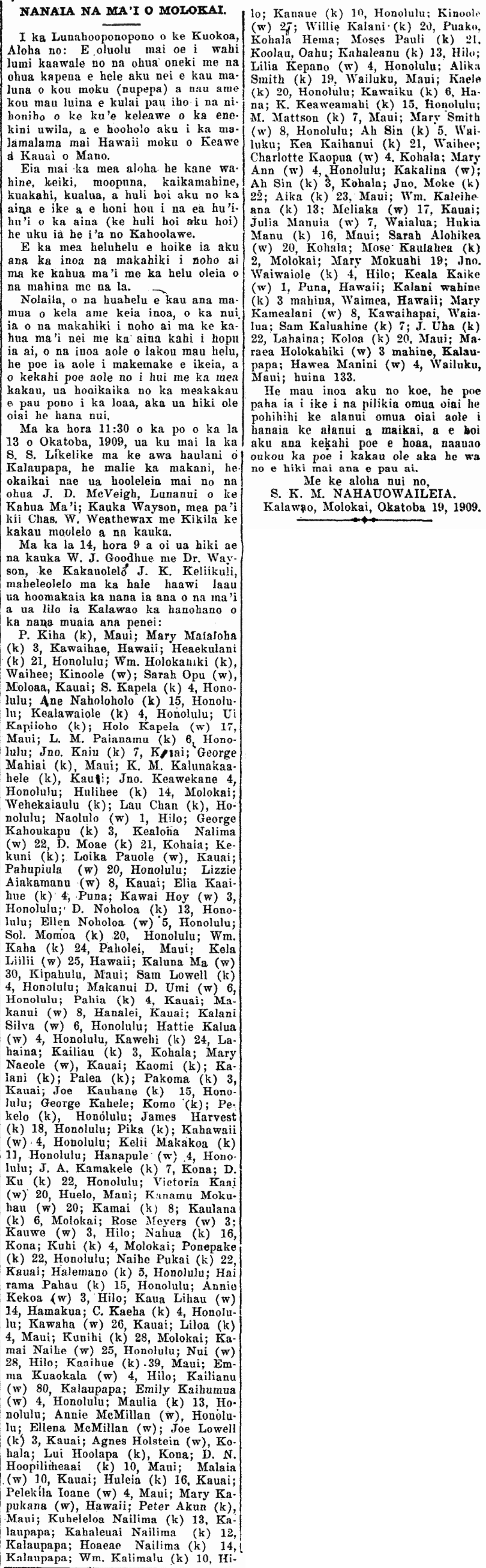 [Wow… this took a long time, but i think it is an awesome document well worth the time put in. My aloha goes out to S. K. M. Nahauowaileia and the type-setting boys of the Kuokoa!!]