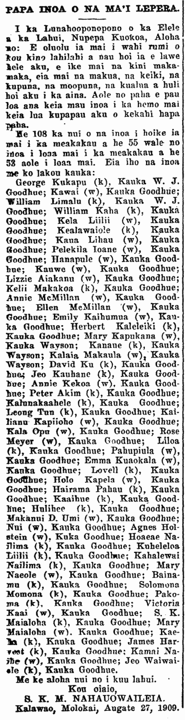 P. Kiha (m), Maui; Mary Maialoha (m), 3, Kawaihae, Hawaii; Heaekulani (m) 21, Honolulu; William Holokahiki (m), Waihee; Kinoole (f); Sarah Opu (f), Moloaa, Kauai; S. Kapela (m) 4, Honolulu; Ane Naholoholo (m) 15, Honolulu; Kealawaiole (m) 4, Honolulu; Ui Kapiioho (m); Holo Kapela (f) 17, Maui; L. M. Paianamu (m) 6, Honolulu; John Kaiu (m) 7, Kauai; George Mahiai (m), Maui; K. M. Kalunakaahele (m), Kauai; John Keawekane 4, Honolulu; Hulihee (m) 14, Molokai; Wehekaiaulu (m); Lau Chan (m), Honolulu; Naolulo (f) 1, Hilo; George Kahoukapu (m) 3; Kealoha Nalima (f) 22; D. Moae (m) 21, Kohala; Kekuni (m); Loika Pauole (f), Kauai; Pahupiula (f) 20, Honolulu; Lizzie Aiakamanu (f) 8, Kauai; Elia Kaaihue (m) 4, Puna; Kawai Hoy (f) 3, Honolulu; D. Noholoa (m) 13, Honolulu; Ellen Noholoa (f) 5, Honolulu; Solomon Momoa (m) 20, Honolulu; William Kaha (m) 24, Paholei, Maui; Kela Liilii (f) 25, Hawaii; Kaluna Ma (f) 30, Kipahulu, Maui; Sam Lowell (m) 4, Honolulu; Makanui D. Umi (f) 6, Honolulu; Pahia (m) 4, Kauai; Makanui (f) 8, Hanalei, Kauai; Kalani Silva (f) 6, Honolulu; Hattie Kalua (f) 4, Honolulu; Kawehi (m) 24, Lahaina; Kailiau (m) 3, Kohala; Mary Naeole (f), Kauai; Kaomi (m); Kalani (m); Palea (m); Pakoma (m) 3, Kauai; Joe Kauhane (m) 15, Honolulu; George Kahele; Komo (m); Pekelo (m), Honolulu; James Harvest (m) 18, Honolulu; Pika (m); Kahawaii (f) 4, Honolulu; Kelii Makakoa (m) 11, Honolulu; Hanapule (f) 4, Honolulu; J. A. Kamakele (m) 7, Kona; D. Ku (m) 22, Honolulu; Victoria Kaai (f) 20, Huelo, Maui; Kanamu Mokuhau (f) 20; Kamai (m) 8; Kaulana (m) 6, Molokai; Rose Meyers (f) 3; Kauwe (f) 3, Hilo; Nahua (m) 16, Kona; Kuhi (m) 4, Molokai; Ponepake (m) 22, Honolulu; Naihe Pukai (m) 22, Kauai; Halemano (m) 5, Honolulu; Hairama Pahau (m) 15, Honolulu; Annie Kekoa (f) 3, Hilo; Kaua Lihau (f) 14, Hamakua; C. Kaeha (m) 4, Honolulu; Kawaha (f) 26, Kauai; Liloa (m) 4, Maui; Kunihi (m) 28, Molokai; Kamai Naihe (f) 25, Honolulu; Nui (f) 28, Hilo; Kaaihue (m) 39, Maui; Emma Kuaokala (f) 4, Hilo; Kailianu (f) 80, Kalaupapa; Emily Kaihumua (f) 4, Honolulu; Maulia (m) 13, Honolulu; Annie McMillan (f), Honolulu; Ellena McMillan (f); Joe Lowell (m) 3, Kauai; Agnes Holstein (f), Kohala; Lui Hoolapa (m), Kona; D. N. Hoopilimeaai (m) 10, Maui; Malaia (f) 10, Kauai; Huleia (m) 16, Kauai; Pelekila Ioane (f) 4, Maui; Mary Kapukana (f), Hawaii; Peter Akua (m), Maui; Kuheleloa Nailima (m) 13, Kalaupapa; Kahaleuai Nailima (m) 12, Kalaupapa; Hoaeae Nailima (m) 14, Kalaupapa; William Kalimalu (m) 10, Hilo; Kanaue (m) 10, Honolulu; Kinoole (f) 27; Willie Kalani (m) 20, Puako, South Kohala; Moses Pauli (m) 21, Koolau, Oahu; Kahaleanu (m) 13, Hilo; Lilia Kepano (f) 4, Honolulu; Alika Smith (m) 19, Wailuku, Maui; Kaele (m) 20, Honolulu; Kawaiku (m) 6, Hana; K. Keaweamahi (m) 15, Honolulu; M. Mattson (m) 7, Maui; Mary Smith (f) 8, Honolulu; Ah Sin (m) 5, Wailuku; Kea Kaihanui (m) 21, Waihee; Charlotte Kaopua (f) 4, Kohala; Mary Ann (f) 4, Honolulu; Kakalina (f); Ah Sin (m) 3, Kohala; John Moke (m) 22; Alika (m) 23, Maui; William Kaleiheana (m) 13; Meliaka (f) 17, Kauai; Julia Manuia (f) 7, Waialua; Hukia Manu (m) 16, Maui; Sarah Alohikea (f) 20, Kohala; Mose Kaulahea (m) 2, Molokai; Mary Mokuahi 19; John Waiwaiole (m) 4, Hilo; Keala Kaike (f) 1, Puna, Hawaii; Kalani wahine (m) 3 months, Waimea, Hawaii; Mary Kamealani (f) 8, Kawaihapai, Waialua; Sam Kaluahine (m) 7; J. Uha (m) 22, Lahaina; Koloa (m) 20, Maui; Maraea Holokahiki (f) 3 months, Kalaupapa; Hawea Manini (f) 4, Wailuku, Maui; total 133.